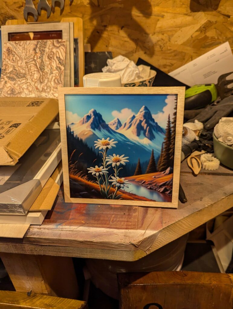Tout sur mesure évidemment, entièrement en bois, impression UV sur le rond central, création des images, de la forme inspirée des fameux flocons de l’ESF le tout sur pied.